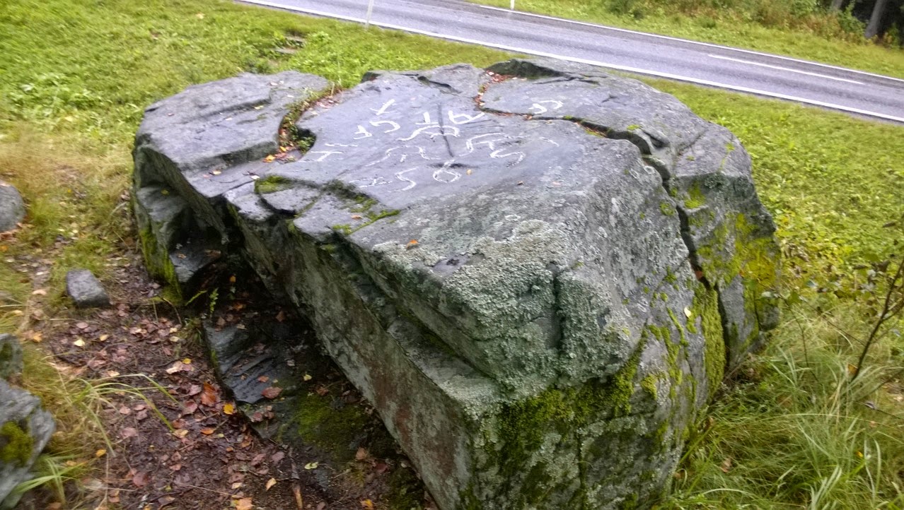 Tutun näköiset nimikirjaimet kalliossa. Kolon takia Claes
